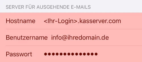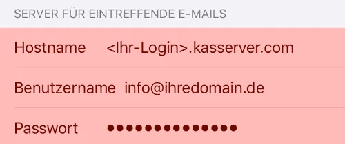 Verwenden Sie als Hostname den <Ihr-Login>.kasserver.com. Unter Benutzername tragen Sie Ihre E-Mail-Adresse ein und unter Passwort, Ihr Passwort für die E-Mail-Adresse.