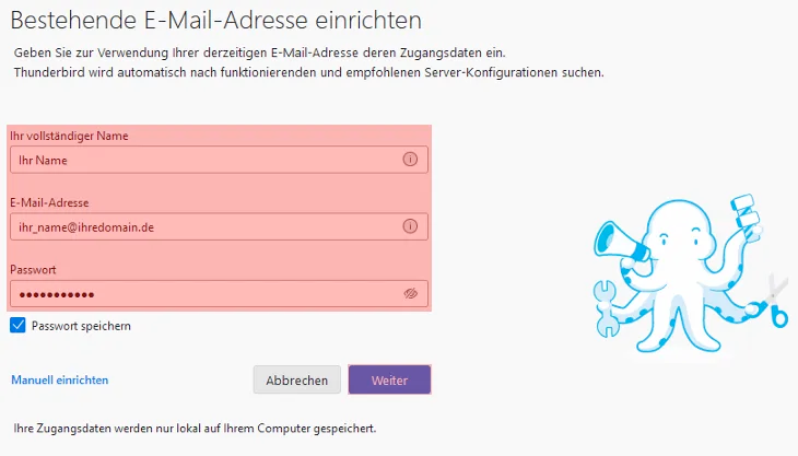 Geben Sie nun im folgenden Dialogfeld Ihren Namen, die E-Mail-Adresse und das Passwort der E-Mail-Adresse ein. Als Passwort verwenden Sie das Passwort, das Sie im KAS (technische Verwaltung) unter E-Mail -> E-Mail-Postfach festgelegt haben.