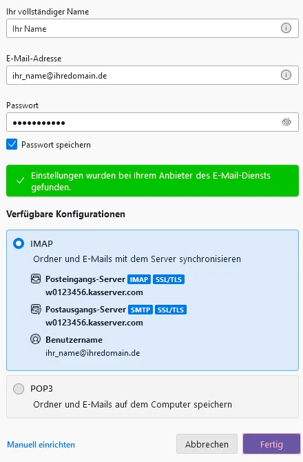 Thunderbird versucht nun selbst, die richtigen Einstellungen zu finden. Wenn dies erfolgreich war, klicken Sie auf Fertig.